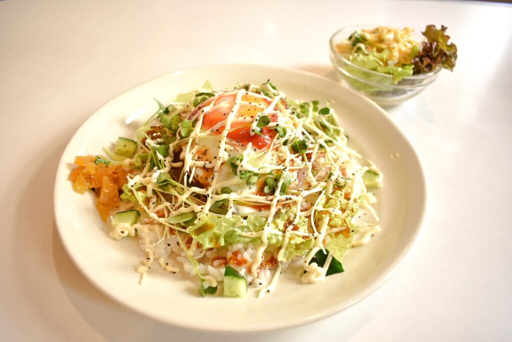 ロコモコは野菜がたっぷり。café mokaのロコモコは、佐賀県名物の「シシリアンライス」をオマージュしています。マヨネーズがかかっている、独特のスタイルです。
