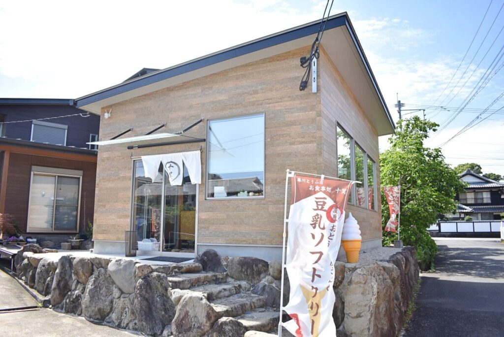 旅館大村屋から徒歩12分、塩田川沿いに藤川豆腐店はあります。そんな藤川豆腐店のそばにあるお店が「十笑」です。